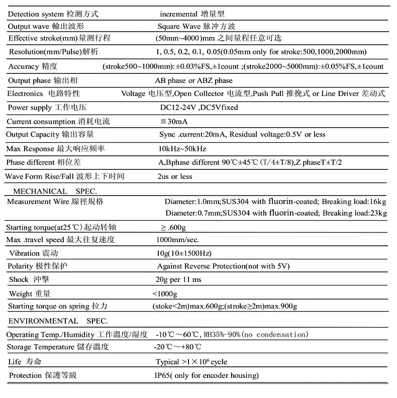 MPS-M 拉線編碼器拉繩尺的參數資料: