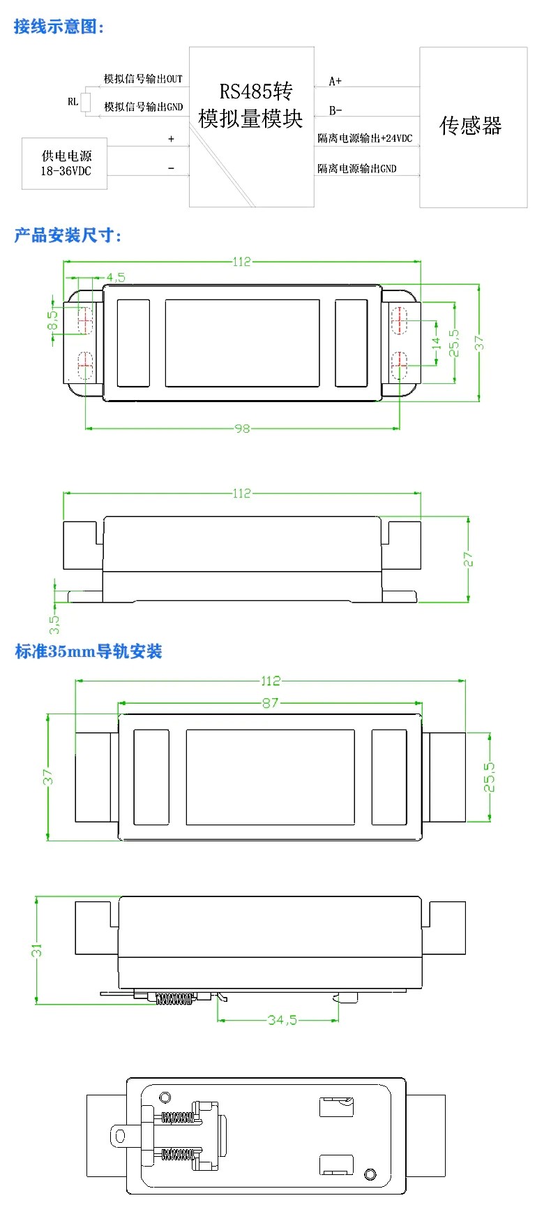 RS485轉模擬量輸出轉換器是一款工業級標準模擬量輸出產品,采用16位DAC芯片,精準的模擬量輸出, 支持4~20mA、0~5V、0~10V。供電電源采用隔離電源,應用層采用標準MODUBUS-RTU協議,符合工業標準,適用于各種工業場合及自動化控制系統等。