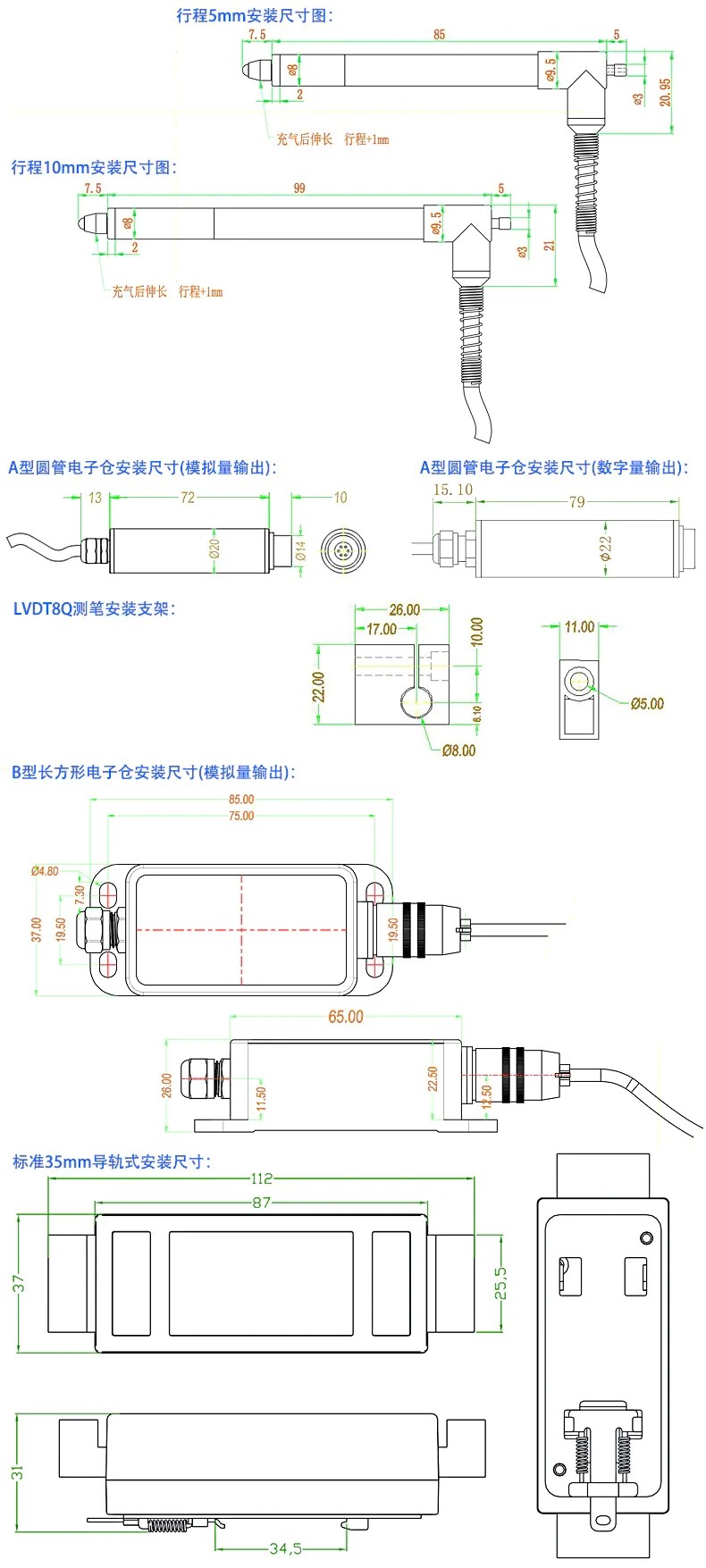 LVDT8Q氣動式位移傳感器安裝尺寸: