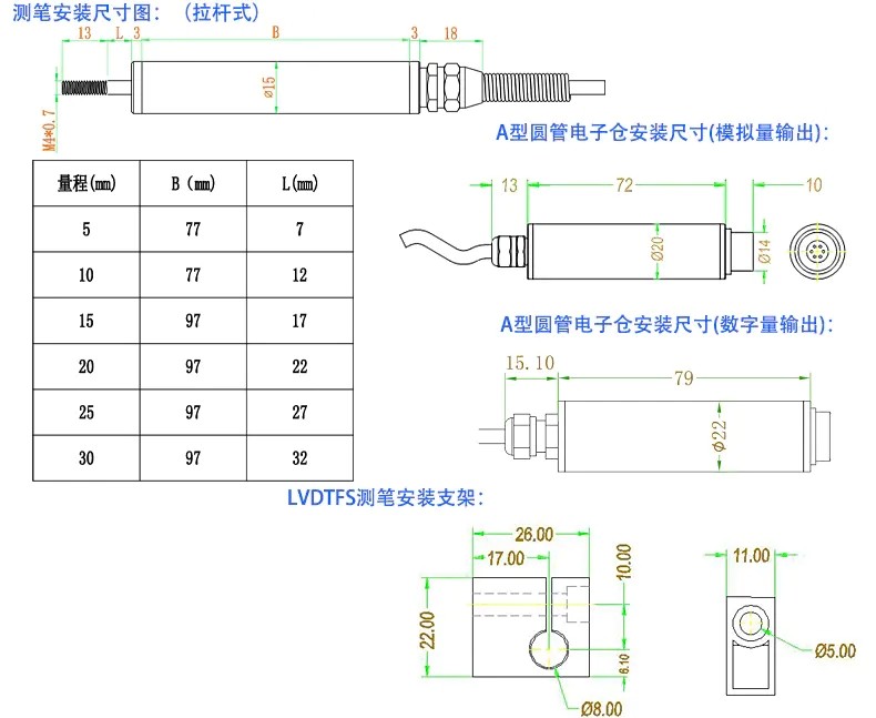 直流LVDT具有優良的性能,采用方便的單電源+12~24V DC供電, 電子電路密封在304不銹鋼金屬管內,可以在潮濕和灰塵等惡劣環境中工作,輸出信號為標準的可被計算機或PLC使用的0~5V, 0~10V,0±5V,0±10V,4~20mA,RS485輸出。