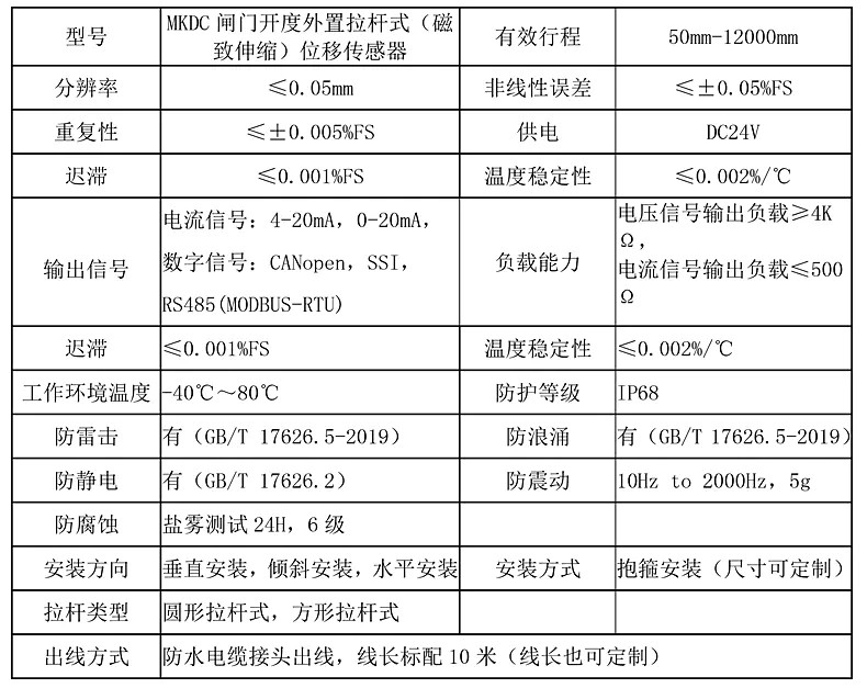 二、閘門開度外置拉桿式(磁致伸縮)位移傳感器標(biāo)準(zhǔn)參數(shù):